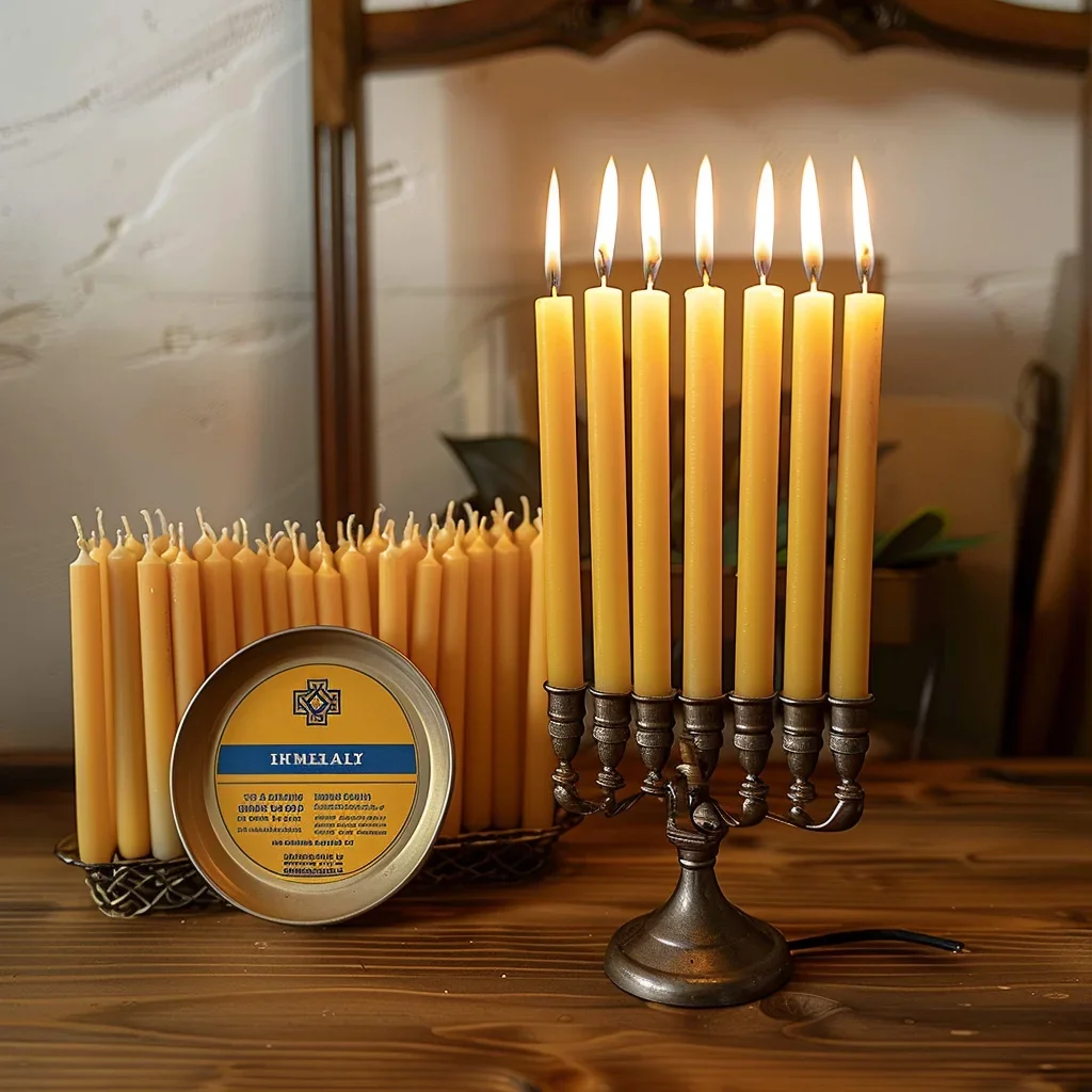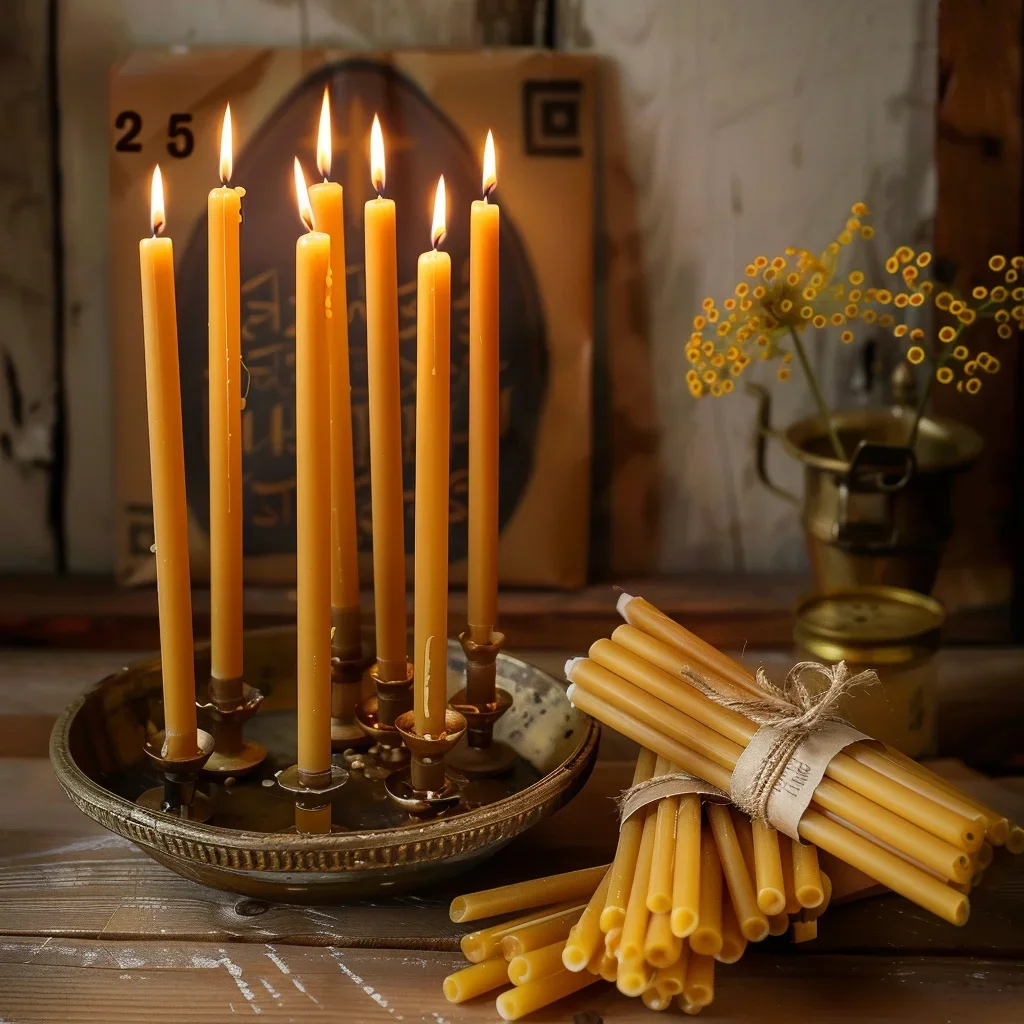 These natural pure beeswax Hanukkah candles are perfect for celebrating the Festival of Lights. Handcrafted from 100% beeswax, they emit a warm, honey-like aroma and create a calm, steady flame without releasing toxins, making them a healthier choice for holiday traditions. Designed for use in a menorah, each candle represents one of the eight nights of Hanukkah, with an additional shamash (helper) candle included to light the others. Their natural yellow color and traditional design add a beautiful, authentic touch to your celebrations. These candles burn longer and cleaner than standard paraffin candles, enhancing the holiday atmosphere with purity and warmth, while honoring a time-honored tradition with elegance and simplicity.